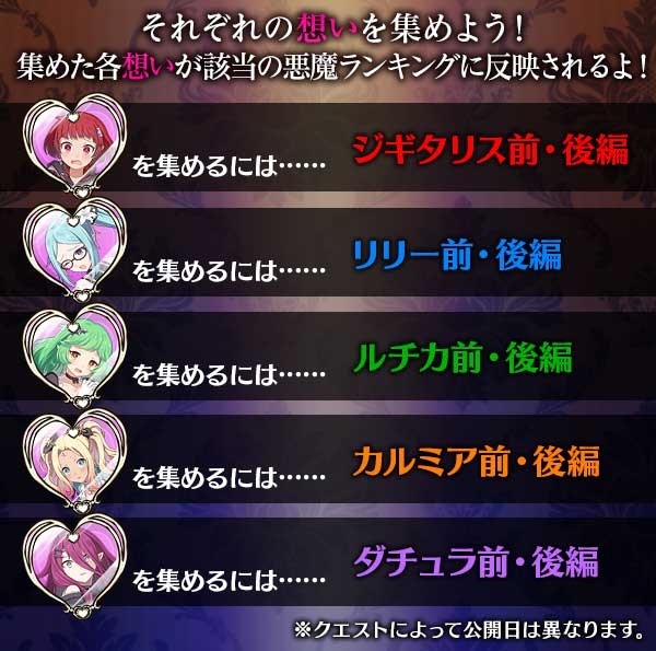 イベント期間中は各悪魔のステージが出現し、それぞれのステージから集めた「想い」は該当悪魔ランキングに反映され、みごと上位に入賞した方には「黒罪ショット所持使い魔」をプレゼントいたします。 その強さで大きな反響を得た「黒罪ショット5種」が報酬に登場! 「黒罪ショット所持使い魔」をゲットする絶好のチャンスです。 ぜひお見逃しなく!