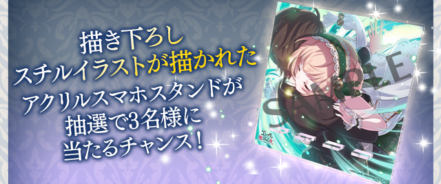 「黄金編キャンペーン応募権」を持って応募フォームで応募すると、描き下ろしスチルイラストが描かれた、アクリルスマホスタンドを抽選で3名様にプレゼントいたします!