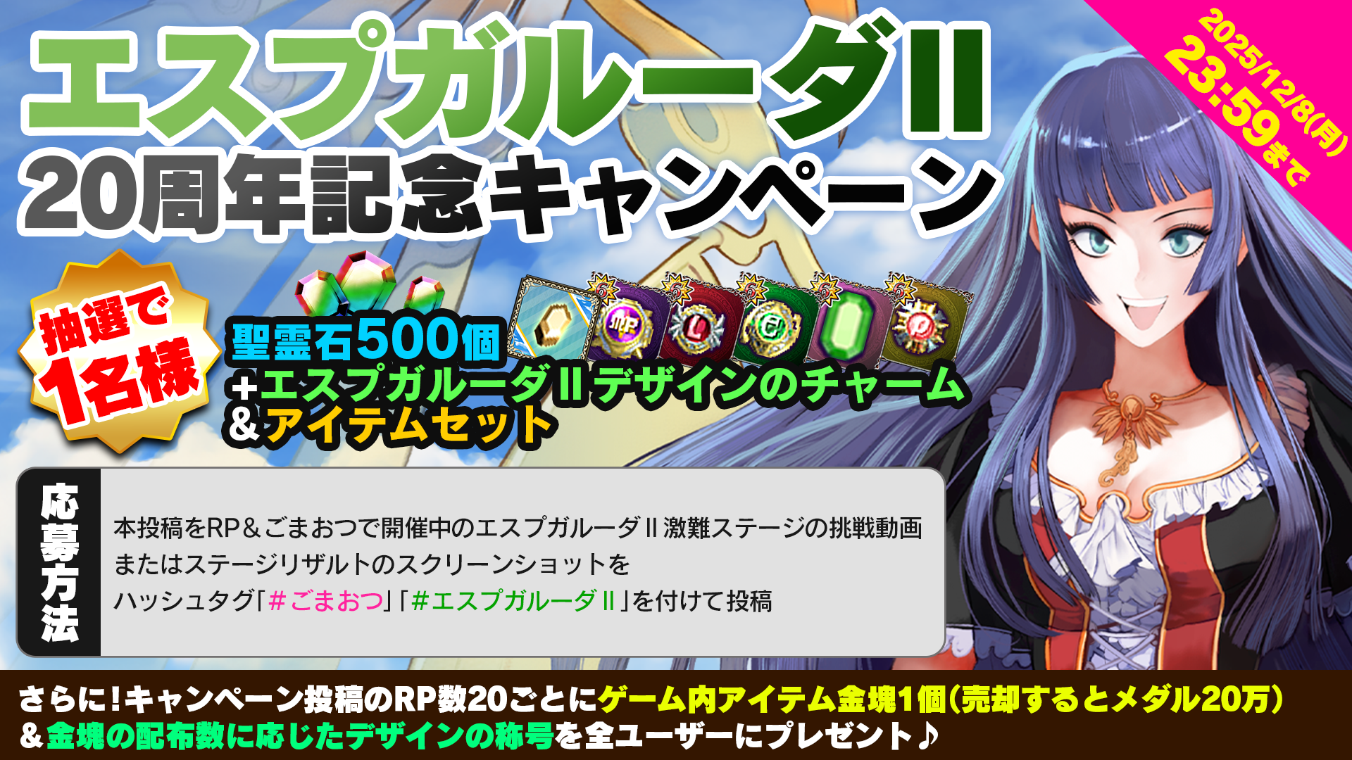 キャンペーン対象の投稿をリポスト&エスプガルーダⅡ激難ステージ「ずっとこの時を待っていた」内のステージに挑戦してステージリザルトのスクリーンショット、または挑戦動画をハッシュタグとともに投稿すると、抽選で1名様に聖霊石500個+エスプガルーダIIデザインのゲーム内アイテムセットをプレゼントいたします。