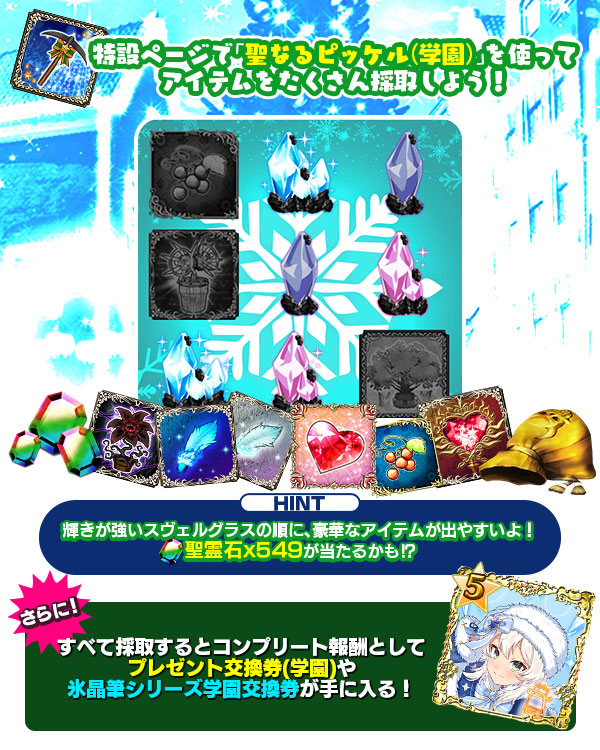 全てのアイテムを採取すると、コンプリート報酬として学園乙女のサインが入ったイラストの使い魔と交換することができる「氷晶筆シリーズ学園交換券」や、豪華報酬と交換できる「プレゼント交換券」が獲得できます。