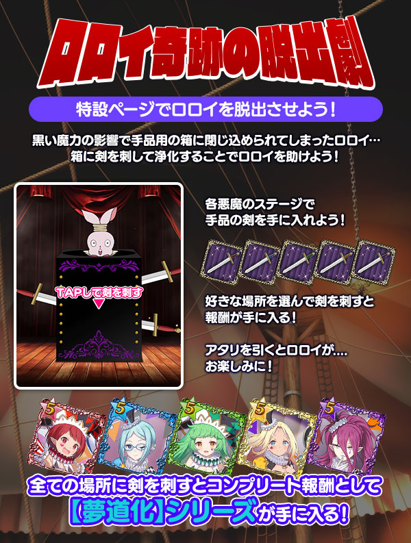 箱に剣を10本刺すと、コンプリート報酬として【夢道化】シリーズの使い魔を獲得することができます。