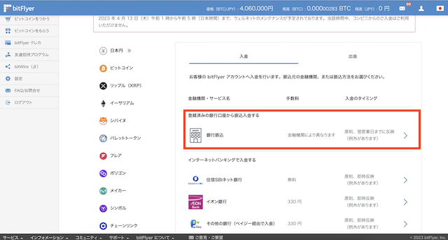 続いて、入出金ページにて「銀行振込」をクリックしてください。