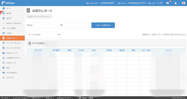 まず、bitFlyerにログインし、画面左側にあるメニューから「お取引レポート」を選択してください。